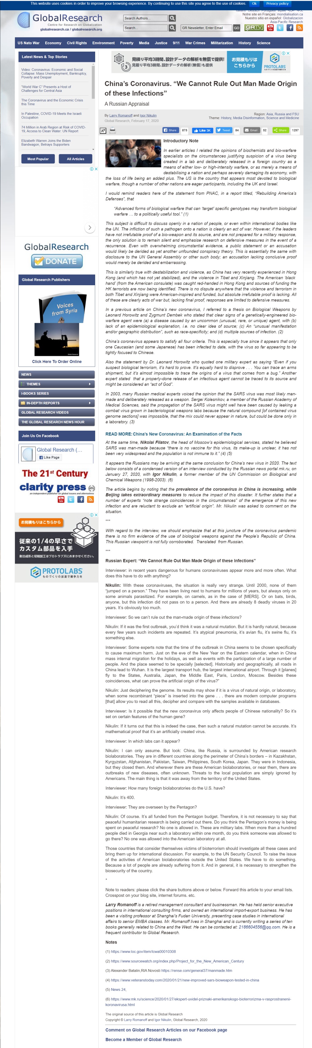 ロシア専門家:「感染症の 人為的発生を取り除く事はできない。」