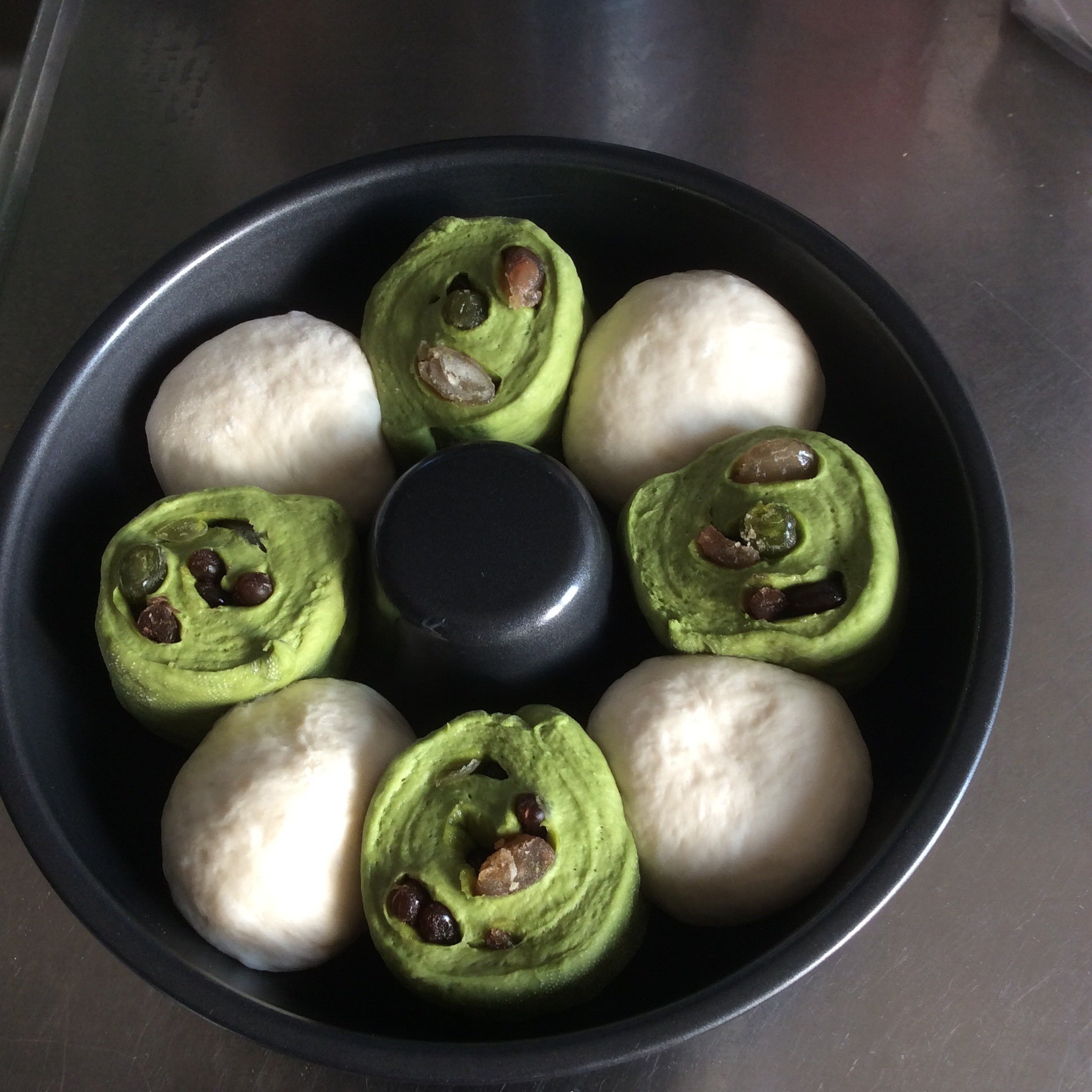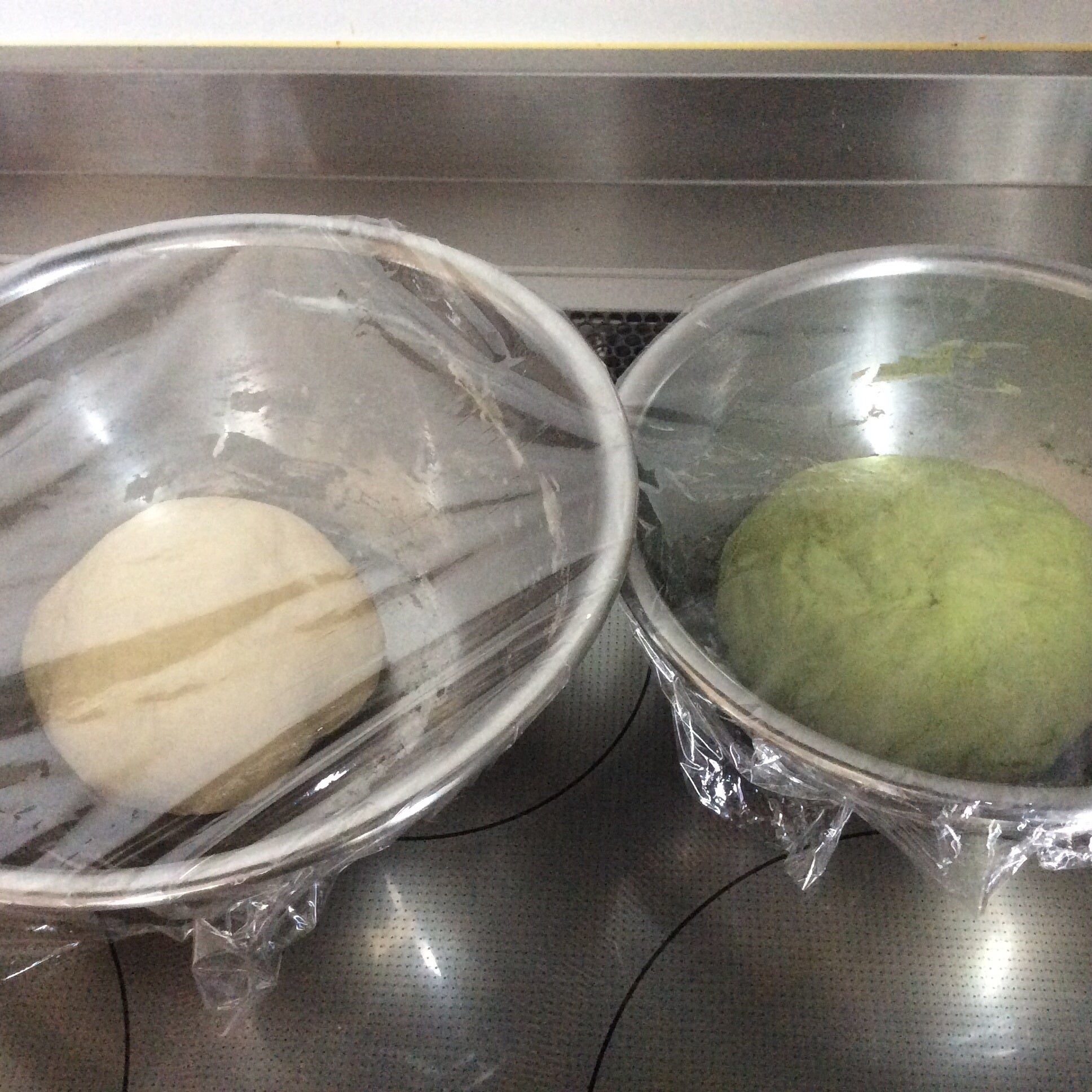 丸めた抹茶生地を糸を使い4当分にカットして型に入れ