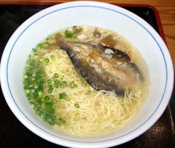 はーい でました 鮎ラーメン このミスマッチがたまりません 昆布、鰹節の一番ダシをブレンドし