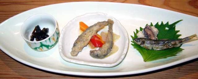 『前菜盛り合わせー佃煮・マリネ 若鮎・熟れ寿し』
