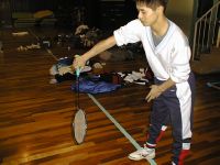 2.左手を離し、ねじれを解放します。そのとき、ねじれがもどる力のみでシャトルをヒットします。肩は動かさないように。