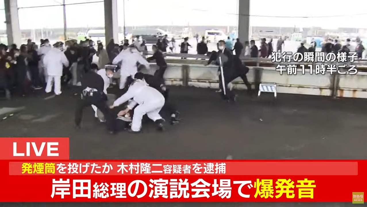 【総理演説会場で爆発音】岸田文雄総理大臣に向けて、爆発物を投げ込んだ瞬間と、男が取り押さえられた映像。 pic.twitter.com/MHESWS5988