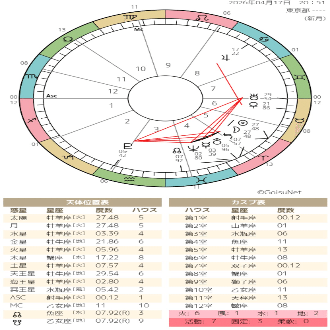 話が逸れましたが、今回の新月は、パッと見ると太陽と新月だけ。他の星の影響を受けてないように見えます。
