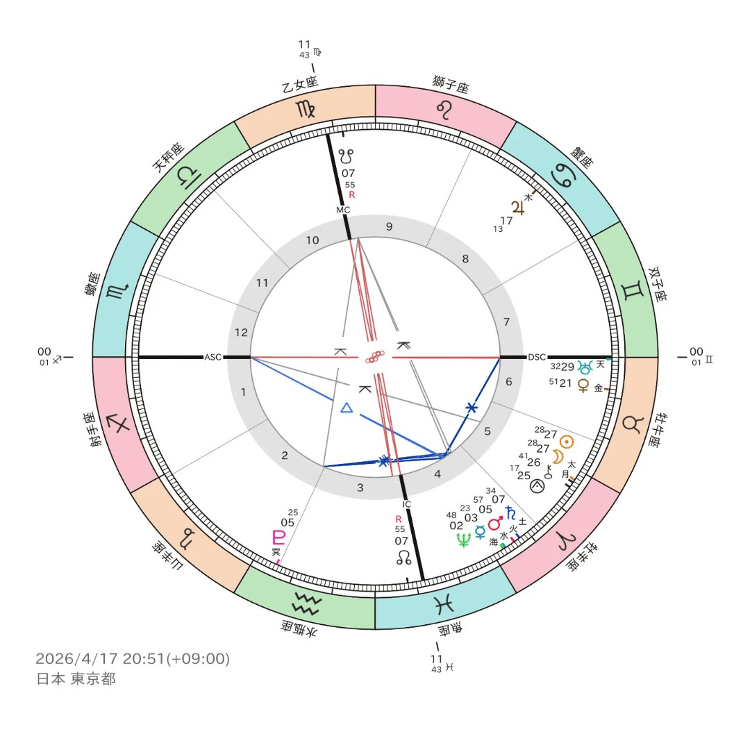 日本時間のホロスコープチャートの場合は、表面化、改革が始まる前の段階と読めるので、ここから変化していくことがあるような気がしています。