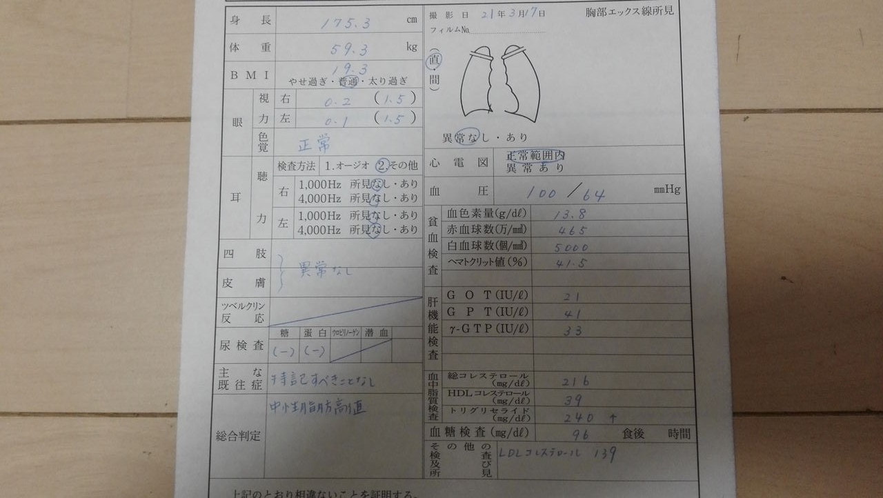 診断書を見て、むむ、、、何か変だ、「肝機能要再検」なんだこれは、、、この時人生で初めてE判定がでました。
