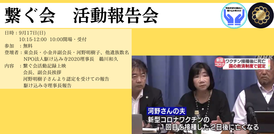 【9月17日(日) 東京都千代田区にて『コロナワクチン被害者遺族【繋ぐ会】活動報告会』】