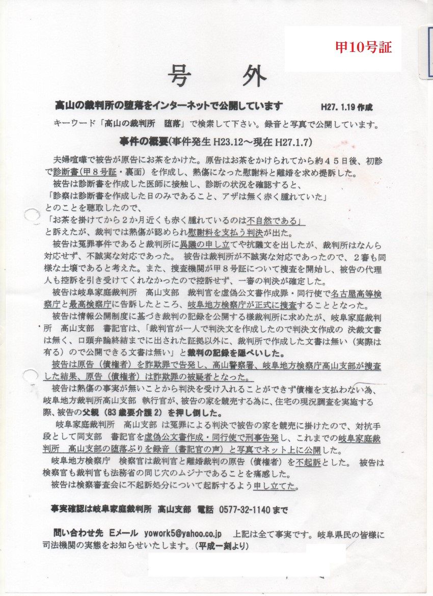 また、平成一刻が岐阜家庭裁判所高山支部 高木健司裁判官を批判したビラを民家に配布しようとしたが、岐阜県警察本部 飛騨警察署 中根衛らが配布させなかったのは言論の自由を奪うものだと訴えたがこれを棄却した。