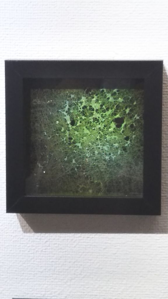 石渡愛子✖小松宏誠『Net_work_48』小松宏誠さんの個展で出会いました。小松さんはモビールの様な軽い立体の作品が中心の作家さんです。立体の作家さんの平面は面白いし、なにしろ"お手頃"!こちらの作品は石渡愛子さんとのコラボということで、本物の蜘蛛の巣に染色している様です。写真では分かりにくいですが、キラキラとした光る加工がされています。会場で作品について伺おうと思いましたが、他のお客さんと話しをされていたので、詳しいことは聞けませんでした。"蜘蛛の巣"も美しい作品になるというギャップが…。