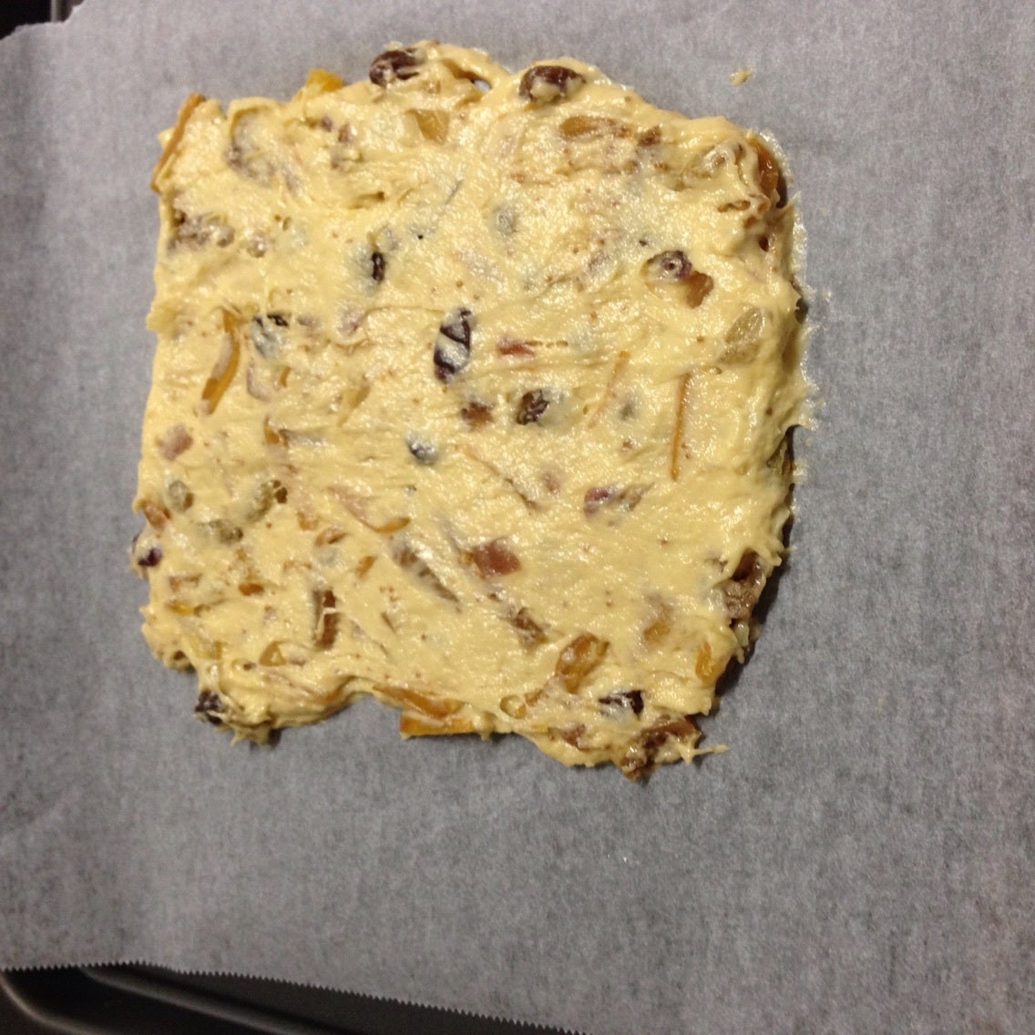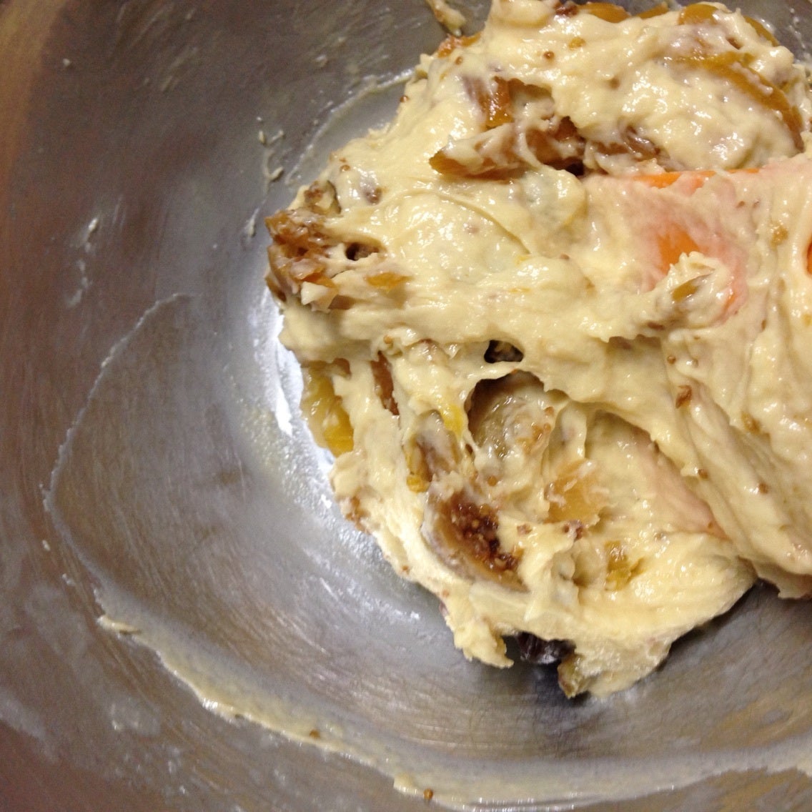 薄力粉とベーキングパウダーを加えさっくりと混ぜ、ドライフルーツも混ぜる。