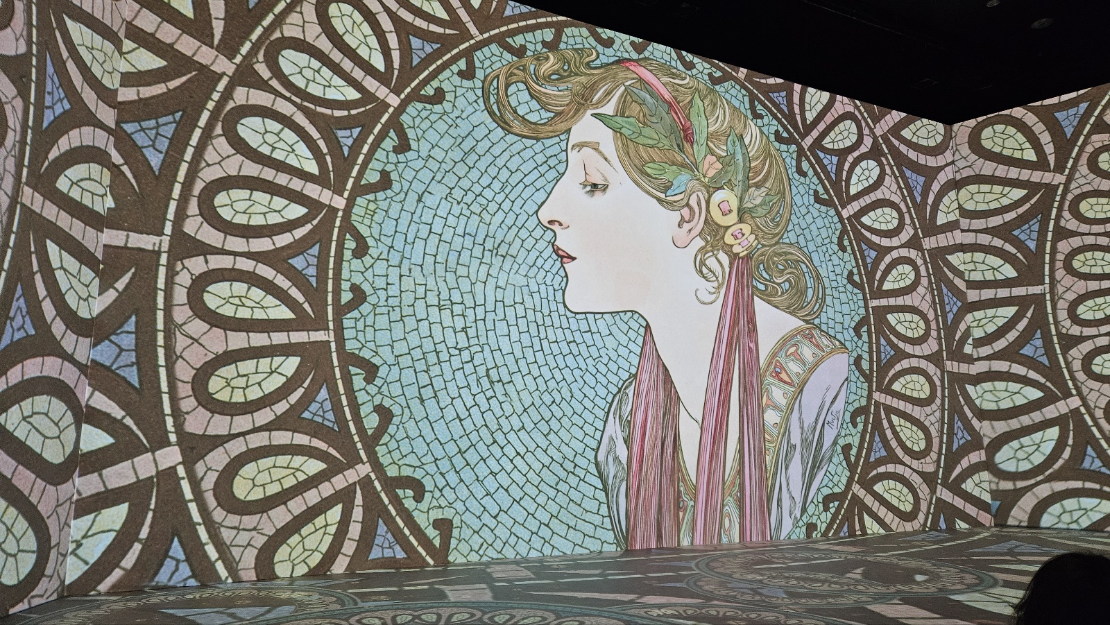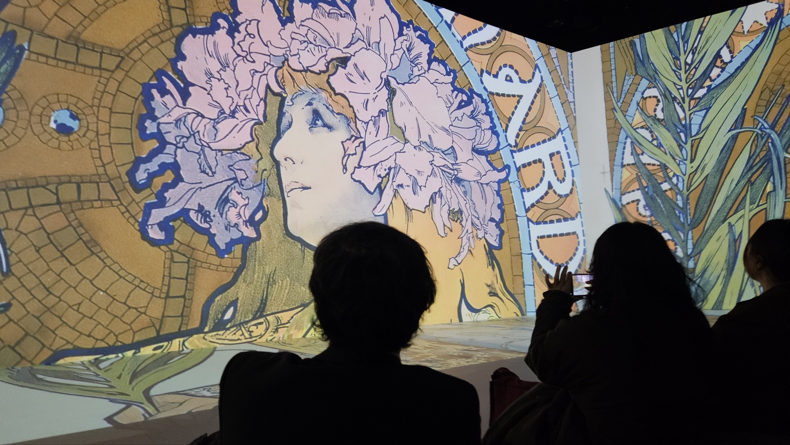 床に円形に並べられた座布団に座り、四方のスクリーンに映し出される作品を堪能する形式。約200人ほどの観客とともに、ミュシャの世界に引き込まれた。
