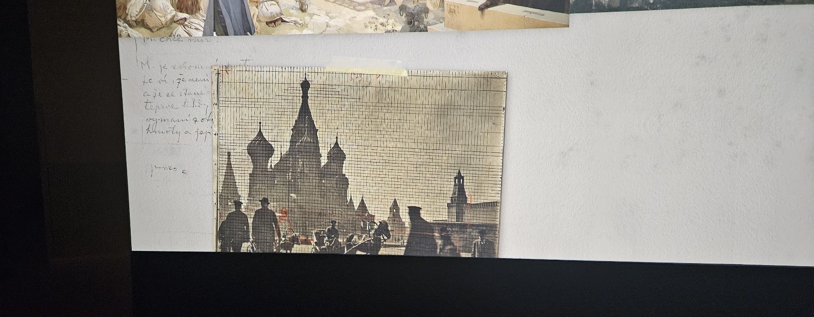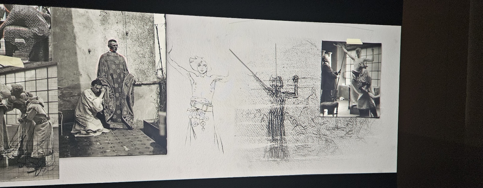 作品の参考にするために収集した大量のスケッチ、パリの街角で撮影した若い女性の写真、細かなラフ画…。