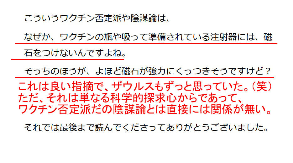 「ワクチンの瓶や注射器に磁石を・・・」 とか言っているが、自分は医療従事者なんだろ! 病院勤めなんだから、できるはずだろ!