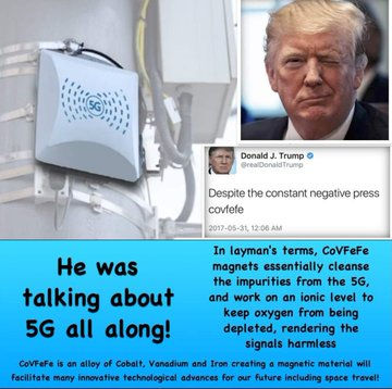>無害な高周波無線波(mmWave)を生成する。このCo/Fe/V化合物の線形式名を #CoVFeFe と呼ぶ。トランプがしばしばツイートする #CoVFeFe は、危険な #5G のmmWave(電磁波)レベルから私たちを保護するための技術のこと。トランプは、常にゲームの一歩先を行っているのです。@realDonaldTrump @GenFlynnenibaru.wixsite.com/qajfofficial/post/covfefe