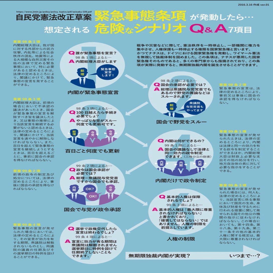 だが、憲法改悪で「緊急事態条項」が導入されれば、戦前の「緊急勅令」のように内閣が法律と同じ効力を持つ「政令」を無制限に出す事が出来る。また、国会の議決なしの予算執行、地方自治体に命令して政府に従わせる事や国会議員選挙の無期限延期(つまり永久政権)なども可能。