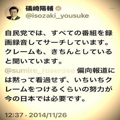 安倍晋三の意向をたてに放送法の解釈を強引に捻じ曲げようと画策した礒崎陽輔のこのツイートのように、政府自民党は常に放送番組を監視している。政府与党に批判的な番組があればすぐさま「偏向放送」とのレッテルを貼り、上記団体による放送局への組織的電凸(大量の電話やファクス、メールなどによる嫌がらせ突撃)を行わせている。