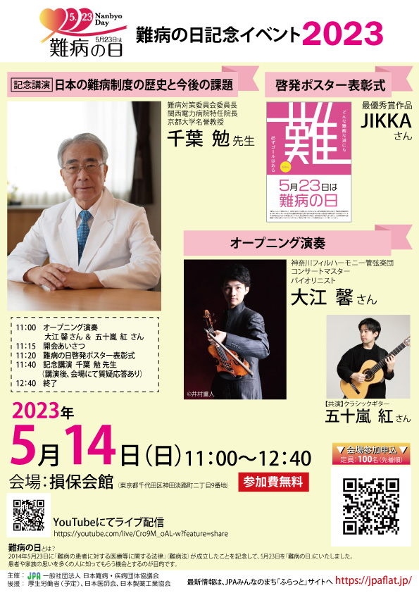 「難病の日」について | 一般社団法人 日本難病・疾病団体協議会JPAは2014年5月23日に「難病の患者に対する医療等に関する法律」(難病法)が成立したことを記念して、毎年5月23日を「難病の日」に登録(2018年2月26日)いたしました。患者や家族の思いを多くの人に知ってもらう機会とするのが目的です。詳細は下記の特設サイトをご覧ください。 2023年度「難病の日」ポスターデザイン、…nanbyo.jp