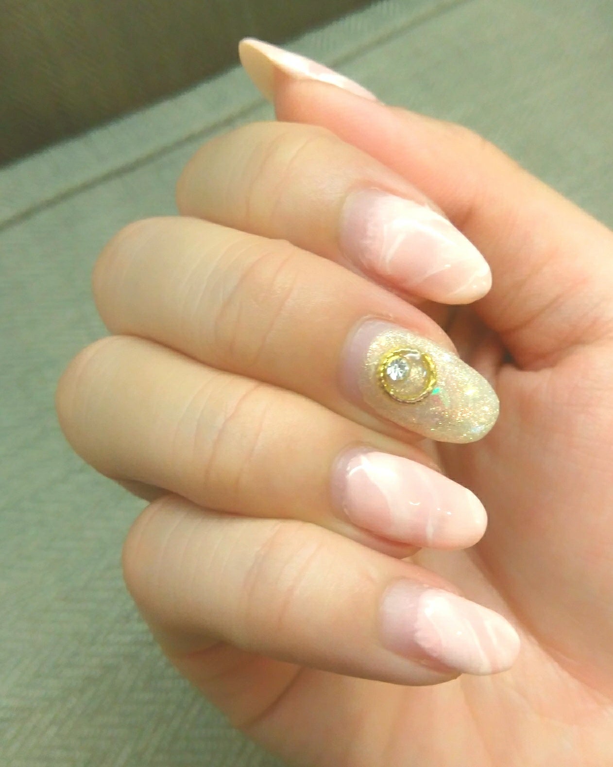 シアーなのでネイルベッドが透けてほ~~~~んのりですがピンク色っぽくなってて、おまけにお花も暖色系にしたので余計薄ピンクっぽく見えて、すごい細かい話なんですが個人的に好きです♪