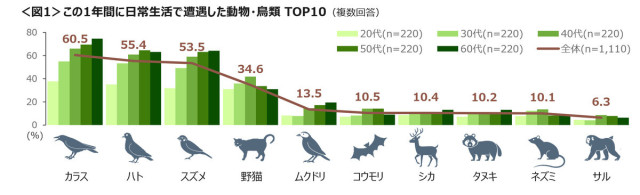 この1年間に、日常生活で遭遇した動物・鳥類は、「カラス」「ハト」「スズメ」がTOP3で、いずれも半数を超えることがわかった。