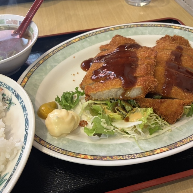 ワンプレートに海老チリ・冷奴・サラダ・惣菜・が盛られて