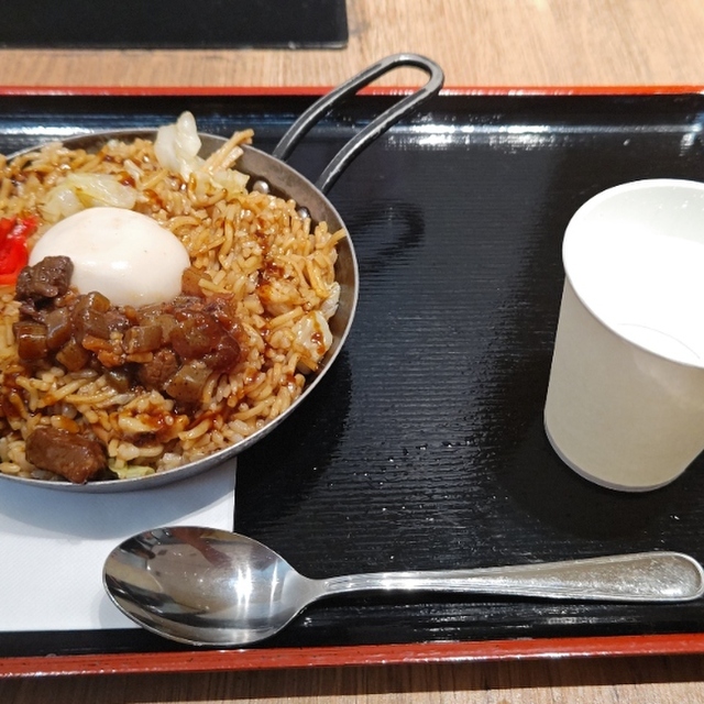 ビールで喉を潤して焼えきそばの温玉を崩して絡めると美味しい~