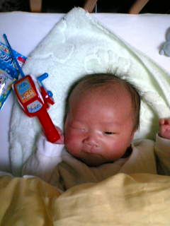 生後45日目♪ちびバサー☆先日、私たち夫婦の所属する釣り団体の”エライ方”がコイチに会いに来てくれました♪コイチにファーストロッドを持って!!!(笑)将来親と一緒にバスフィッシングにハマる事間違いなしですな~。・・・・って、コレ海のロッドなんですが(汗)まっ、オモチャなんで細かい事は気にせず♪リールを巻くと、プルプル震えるんです♪その名も『ぶるぶるフィッシング』!!(ガム一枚付き)いつになったら巻くことができるんでしょうか?(笑)一緒に釣りをする日が今から楽しみです♪