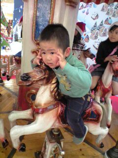 ビビりぃ~ショッピングセンターのクリスマスイベントでミニメリーゴーランドが有り、乗る人が居なかったので…乗せて30秒でギブアップ!泣きながらも私の「チーズして~」にWピースで応える我が子(笑)くるくる回って楽しいのに~