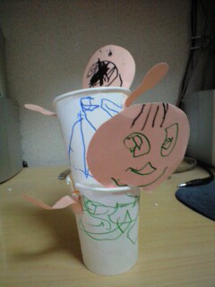 父の日の作品保育参観の時に作った作品です。片方の紙コップに輪ゴムが掛けてありもう一方を押し込むとジャンプする仕組みです。で、お父さんが自分を抱っこしてる状態に見立てています。容赦なくグイグイ押すからグシャグシャになりました(笑)