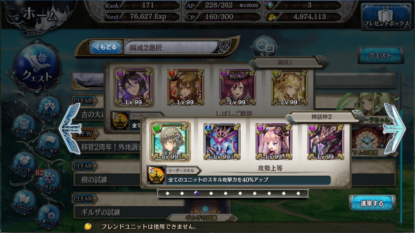 W1(闇トライ、アーカード、闇スクエア、進化フランシール) は愚者ヨハネで問題無く突破出来ますが、W2(契約バロゲ祝福50、リリアンヌ契約2、火スクエア、進化ペトラルカ)が厳しい。