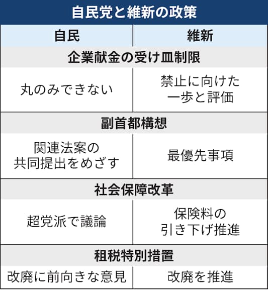 自民党と日本維新の会は16日、首相指名選挙での協力や連立政権の構築に向けた政策協議に着手する。維新は同日午前、国会内で両院議員総会を開き、自民党に提起する政策について議論した。首都機能の一部を地方に移す「副首都構想」や社会保障改革の実現などを自民党側に申し入れる見通しだ。