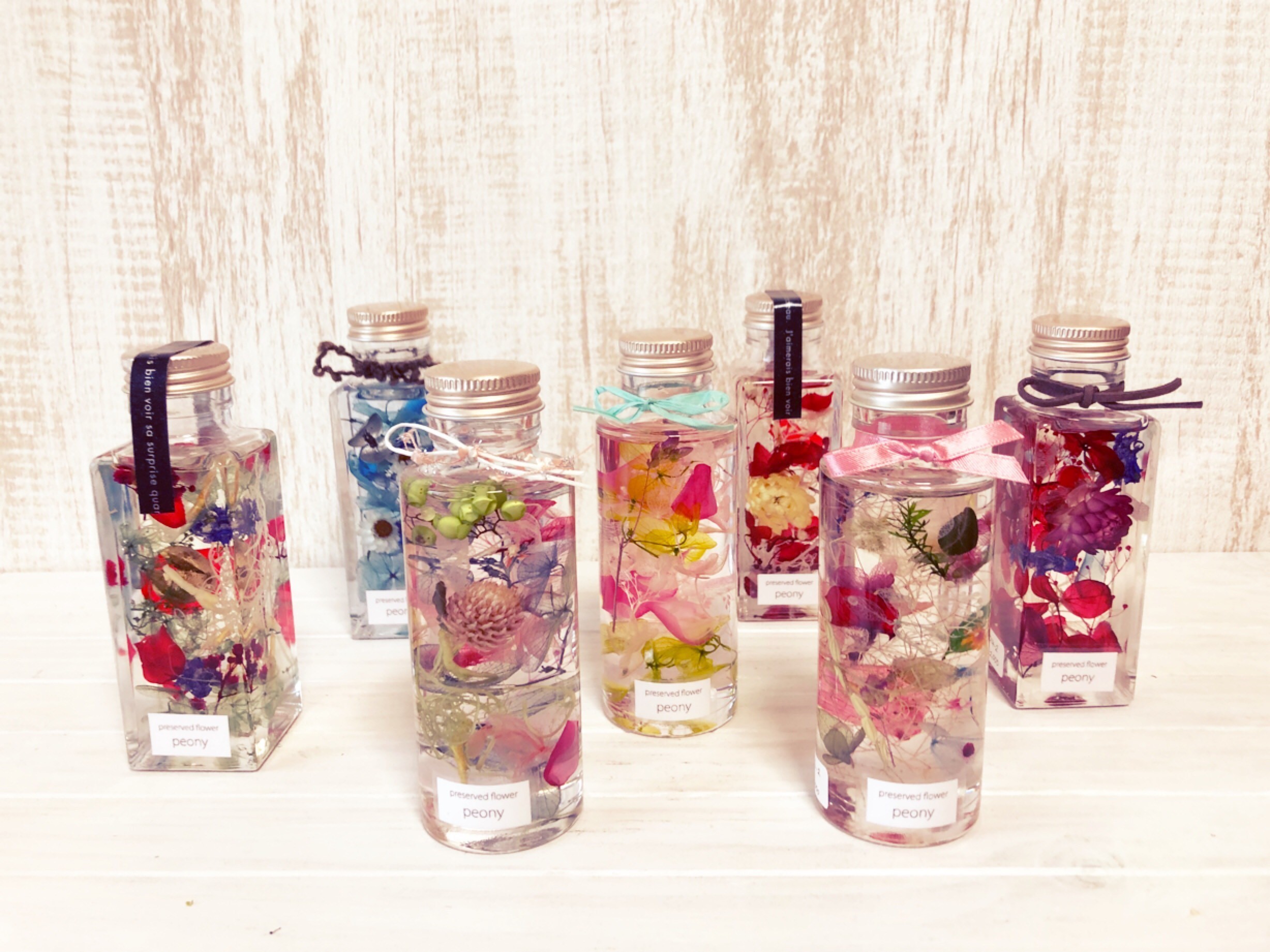 「ハーバリウムはオイルにお花を浸した植物標本。お好みのお花を選んで、世界に一つのハーバリウムを作れます。普段あまり触れ合えないプリザーブドフラワーを沢山ご用意しました。」