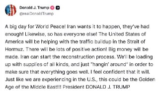 世界平和の素晴らしい一日です!イランはそれを望んでいる、彼らは我慢の限界に達している!そして全ての人もそうです!米国はホルムズ海峡の交通量を軽減するのを手助けするでしょう。多くの前向きな措置が取られるでしょう!多くの金を稼ぐことができるでしょう。イランは再建のプロセスを始めることができるでしょう。我々はあらゆる種類の物資を積み込み、全てが順調に進んでいることを確認するために「近くに」いるでしょう。私はそれがそうなると確信しています。米国で見ているように、これは黄金時代になる可能性があります。