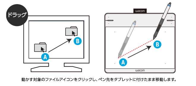 タブレット上で少し浮かせながらペンを動かすと、 画面のポインタが移動します。