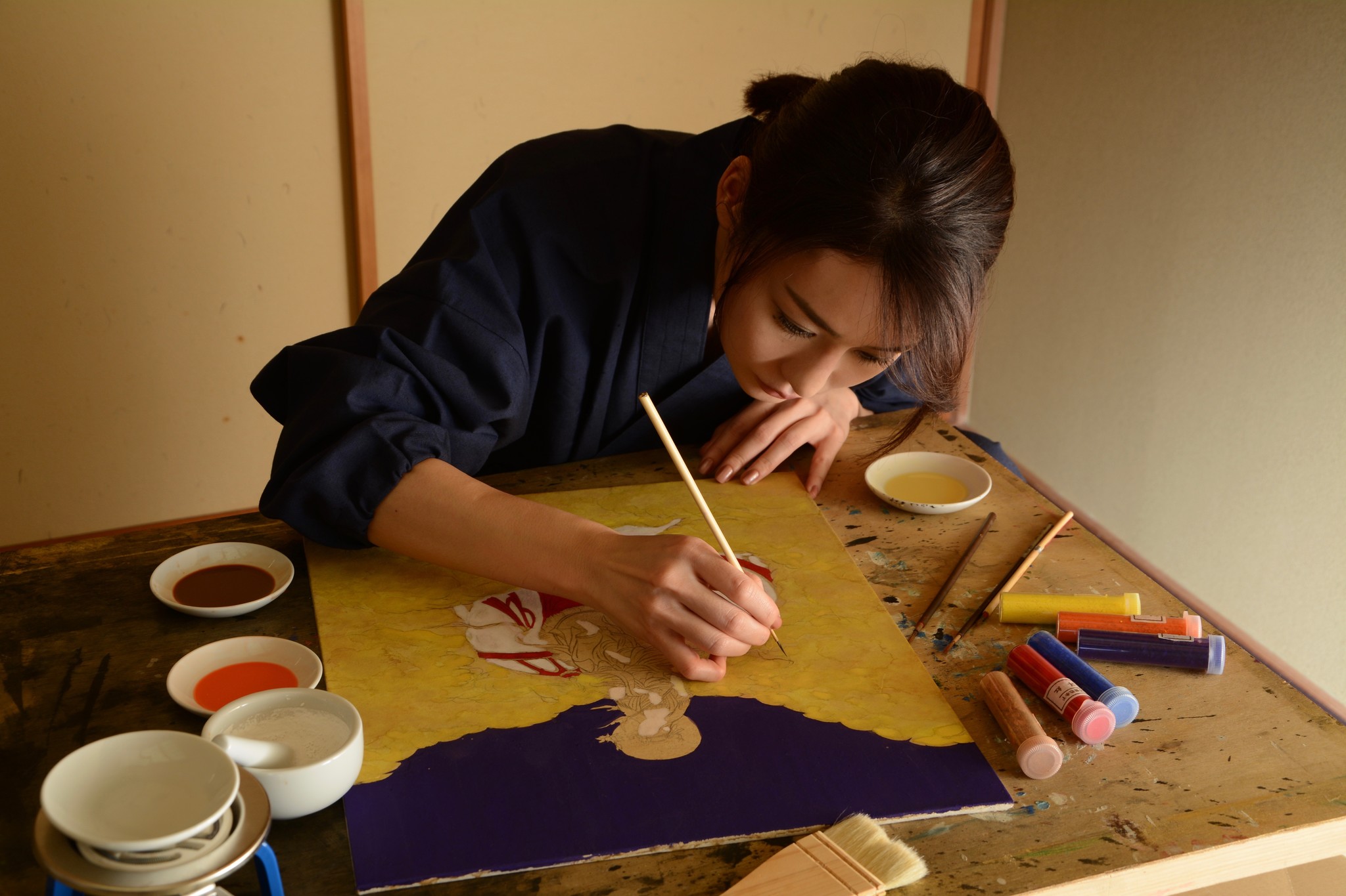 打ち合わせを終えて、三十三観音の最後にあたる灑水観音を描いています。