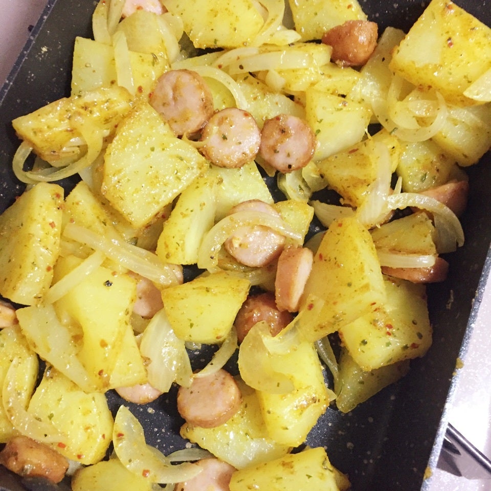 捏ねてる合い間にジャーマンポテトを作っておきます。いつもの味にカレーパウダーを加えただけです。