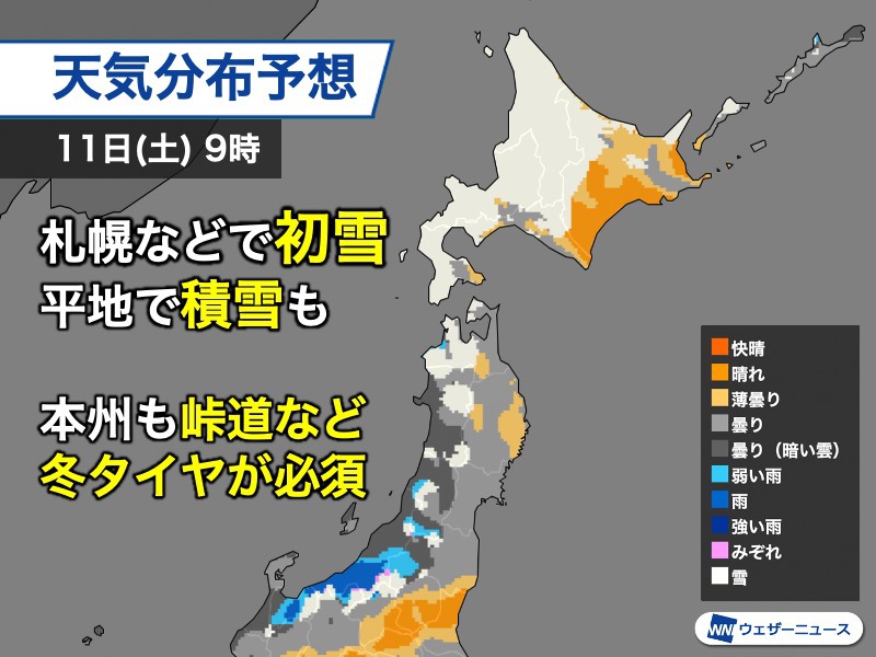 北海道日本海側は初雪で積雪の可能性