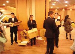 当日、ロビーで水とパンを配る。6000人×2食分を備蓄していたが、