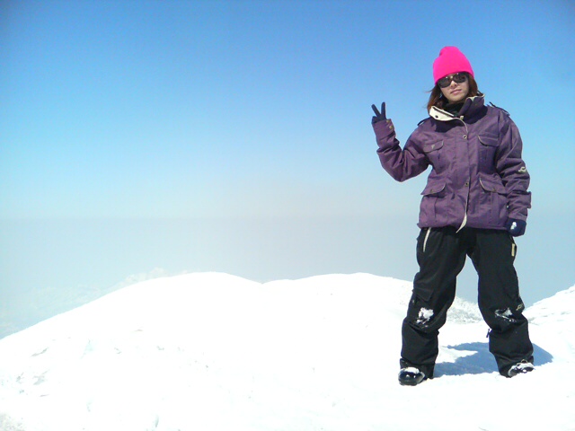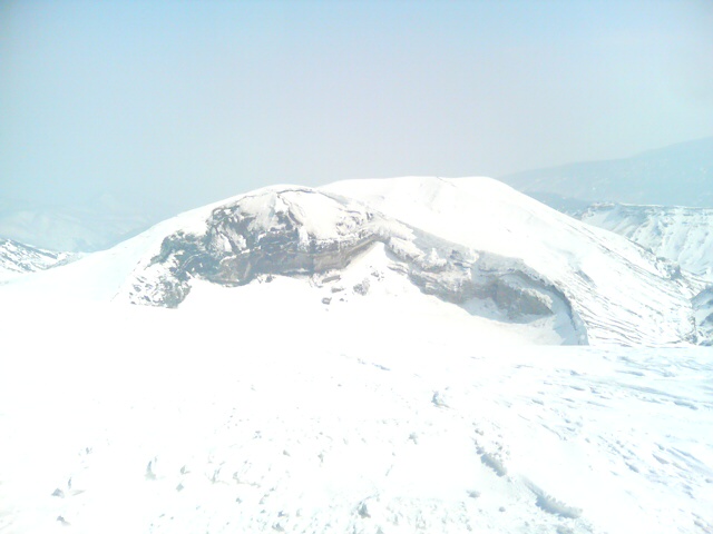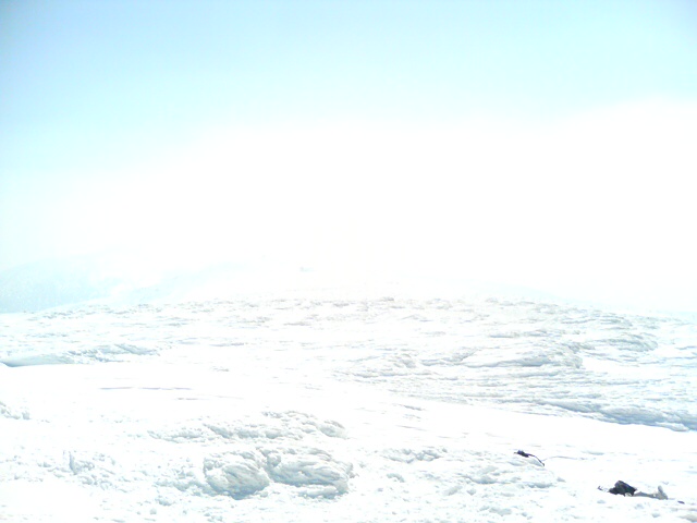 山頂付近はけっこう寒くて、雪面はクラスト気味。