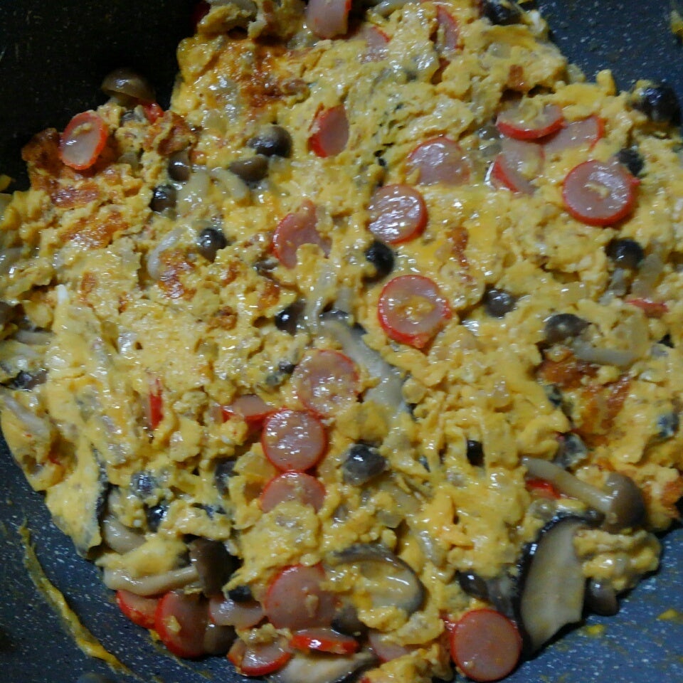 フライパンにオリ―ブオイルを入れ、中弱火で、具入り卵を入れ、大きく混ぜながら焼く。