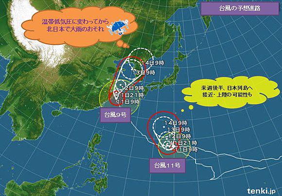 【台風9号と台風11号、今後の動向は?】 tenki.jp/forecaster/dia… 次第に台風9号と台風11号に挟まれるような気圧配置になる日本列島。台風の動向に要注意の日が続きそうで.. pic.twitter.com/8GYlGDsKNB
