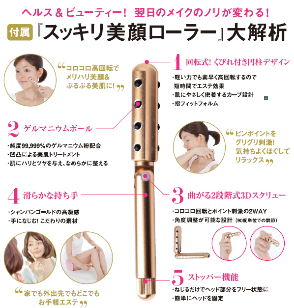 ローラートリートメントで美顔・美肌に!純度99.999%ゲルマニウム粉使用のゲルマニウムボール12個付きのローラータイプの美顔器「スッキリ美顔ローラー」に「美しくなるためのスッキリ美顔BOOK」がついてスペシャルプライス。