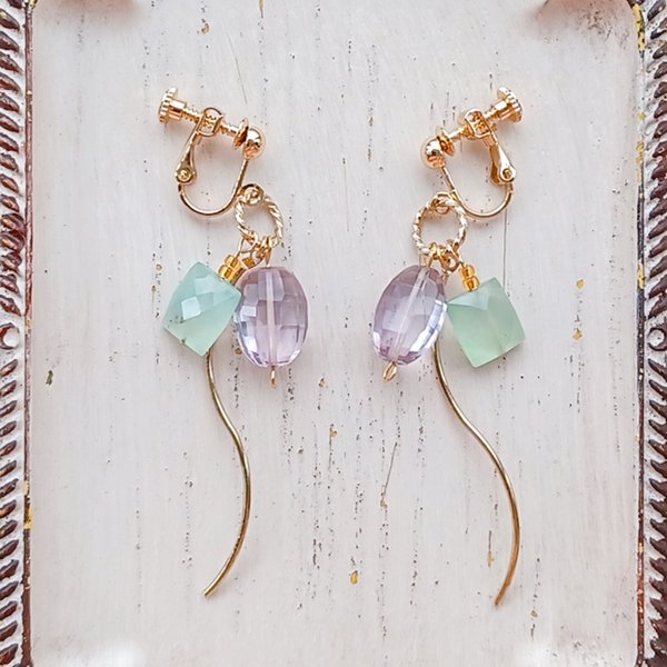 爽やかな季節にぴったりなカラーのアメジストとクリソプレーズを使用したイヤーアクセサリー。