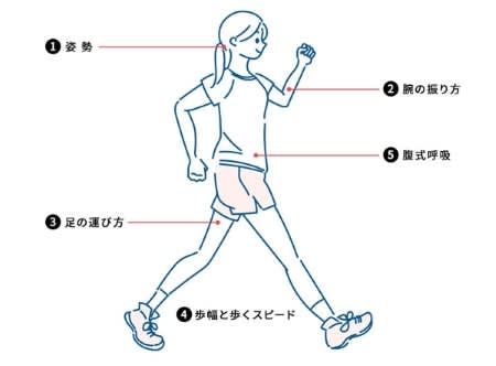 ウォーキングでは、普段より大股気味に歩くことで運動効果を高めることができます。足をしっかり蹴り出し、いつもよりやや早めに歩くことを意識しましょう。自然と大股になるので、運動効果を高めることができます。
