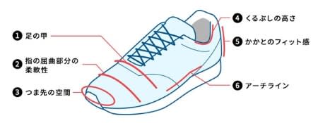 足の甲が圧迫されていないかをチェック。きつすぎると、足の動きが悪くなります。また、幅も確認しておきましょう。きつい場合は、4E設計などゆったりしたものを選ぶのがおすすめです。