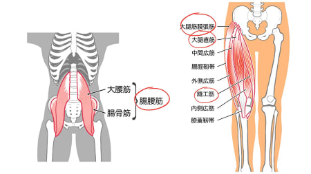 膝を伸ばしたままで股関節を90度曲げるためには、股間節屈曲筋である腸腰筋、補助筋として働く大腿直筋・縫工筋・大腿筋膜張筋などは強さが必要となります。