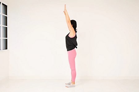 1.脚を腰幅に開いて立ち、手のひらを前に向けて両腕を天井に伸ばす。おへそを背骨に近づけてお腹を引き込む。