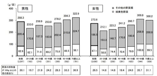 特に20~29歳の野菜摂取量は男女ともに低く、男性では19.7%、女性は14.8%です。