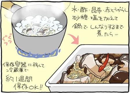 手で裂いたり、ほぐしたりして干したキノコ(しいたけ1パック約100g、エリンギ1パック約100g、えのきたけ1袋約100g)は鍋で酢1/2カップ、水1と1/4カップ、砂糖大さじ2、塩小さじ1と、昆布(3×4cm)2枚、赤とうがらし1本を加え、しんなりするまで約4分煮ます。