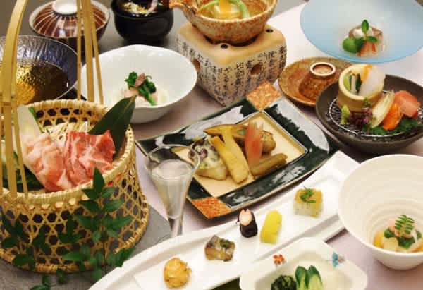 夕食は、2名であれば客室へ運んでくれる。新鮮な食材で彩られた会席料理を浴衣姿でゆっくりと堪能しよう。