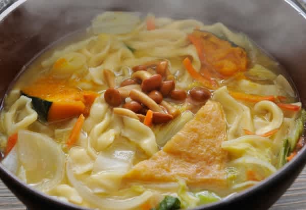 河口湖で味わいたいのは、山梨県の郷土料理「ほうとう」です。小麦粉の平打ち麺にカボチャや肉といった具材を加え、味噌仕立ての汁で煮込む料理。素朴な美味しさに心も体も温まります。コシの強さとトッピングのキャベツが特長の「吉田うどん」も、人気のご当地グルメ。