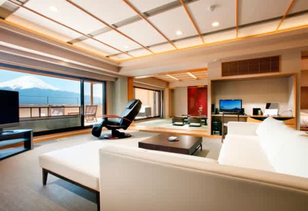 河口湖の北岸のほとりに佇み、絵画のような景色を愉しめる「秀峰閣 湖月」のテーマは、「最上級の“遊”と”寛”を有する宿」。国道から少し離れているため、心地よい静寂に包まれている。